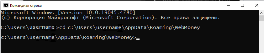 - для этого введите команду "cd c:\Users\***\AppData\Roaming\WebMoney" и нажмите Enter (Ok)