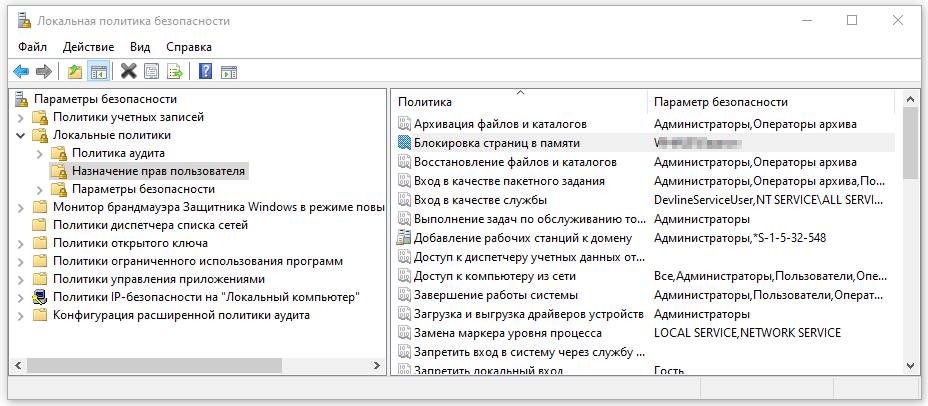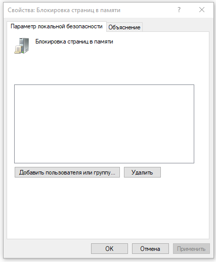 - Найдите параметр: Блокировка страниц в памяти (Lock pages in memory).