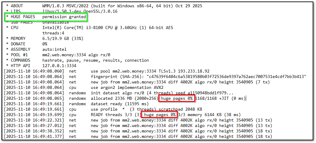 Если в логе майнера большие страницы разрешены, т.е. есть строка- HUGE PAGES permission granted* а далее в логе пишется huge pages 0%