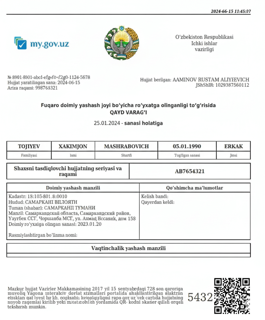 Выписка о регистрации по месту постоянного проживания гражданина - справка о регистрации по месту жительства на территории Узбекистана
